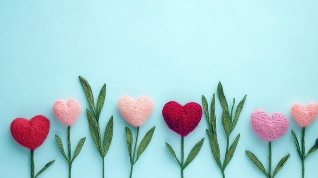 A line of charming hand - crocheted heart shapes on green stems, in hues of red, pink, and light pink, set against a soft blue backdrop, ideal for a tender and affectionate decor theme.