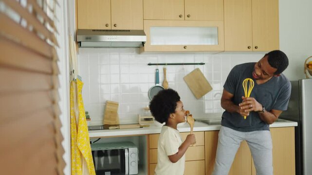 Black African American Father and son pretending to sing using kitchen utensils as microphones while standing in a kitchen, expressing fun, creativity, and joyful bonding.