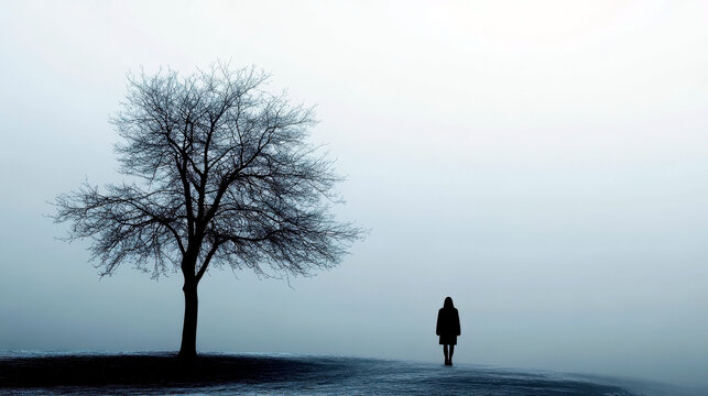 Silhouette of lonely girl in fog next to tree without leaves. Back view. Seasonal depression Awareness Month. Horizontal banner. Free space for text. Seasonal affective disorder (SAD)
