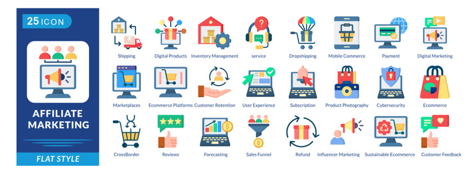 Affiliate Marketing icon set in flat style, featuring Shipping, Fulfillment, Products, Inventory, Management, Dropshipping, and Commerce.