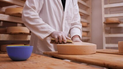 Worker cleaning and brushing the cheese wheels with salty water to help the traditional maturation process. Turning and wiping the cheese before storing again on the shelves