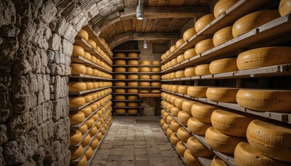 Cheese wheels stacked in a long farm cellar representing artisanal dairy storage and cheese maturation process