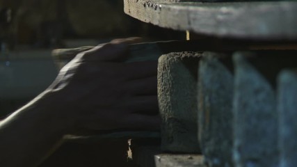 Man's hand checking organic aged cheese ripening in his cave closeup