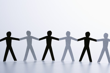 Affirmative action encompasses initiatives such as diversity and inclusion, equal opportunity, and quota systems for minority groups, represented by a wooden model of people holding hands.