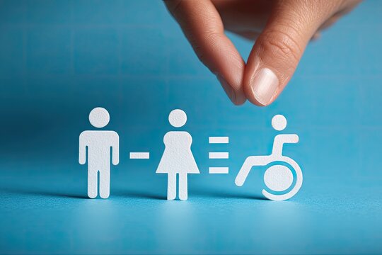 Hand placing figure of wheelchair user, completing inclusivity equation. Gender neutral symbols