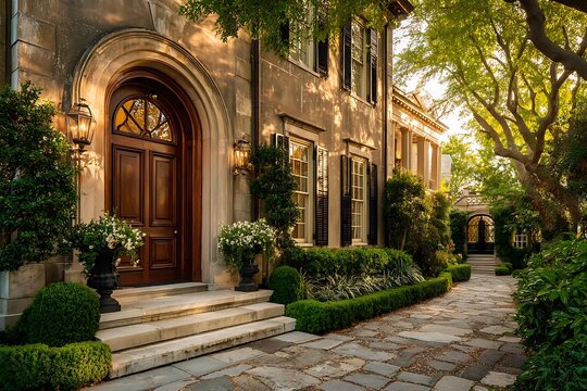 Luxurious dwelling access showcasing curved entrance and maintained foliage signifying wealth amidst daylight brilliance