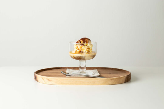 Affogato coffee on a rustic wooden table