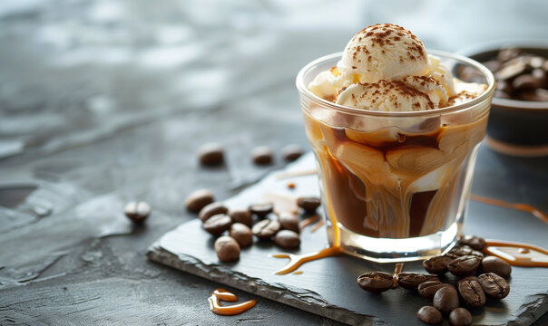 affogato coffee with ice cream and espresso on a granite table with copy space wallpaper