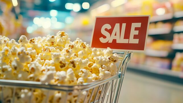 Fresh Popcorn for Sale in Grocery Store Cart on Discount Signage