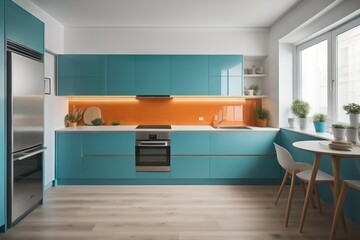Turquoise kitchen in studio apartment. Interior design of modern living room