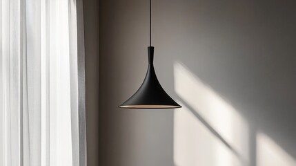 Modern pendant lamp casting shadow on beige wall, beside sheer window curtains