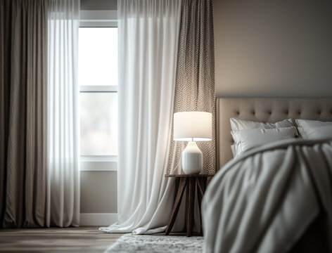Gauzy and casual curtains in a contemporary bedroom. Generative AI.