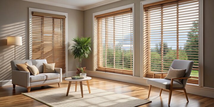 Horizontal faux wood blinds with classic white slats filter natural sunlight, casting subtle shadows on a modern, neutral-colored wall in a stylish interior setting.