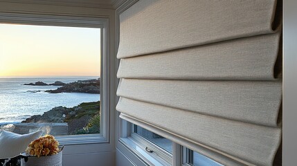 Elegant, cream-colored Roman blinds with subtle folds and a delicate trim, filtering soft, warm light into a serene, minimalist interior space with a neutral background.