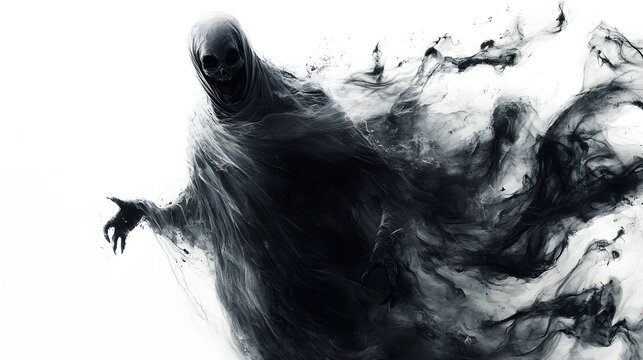 Enraged ghostly figure, Halloween masks swirling around, dark and haunting style, vivid details, isolated on white background