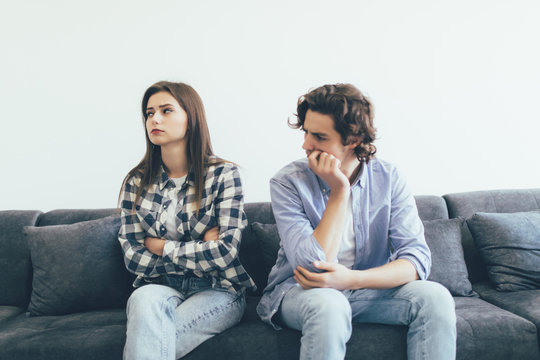 Offended young caucasian woman sitting on the couch back to young caucasian man who trying to apologize, but she refuses it. Concept of problems in couple relationship