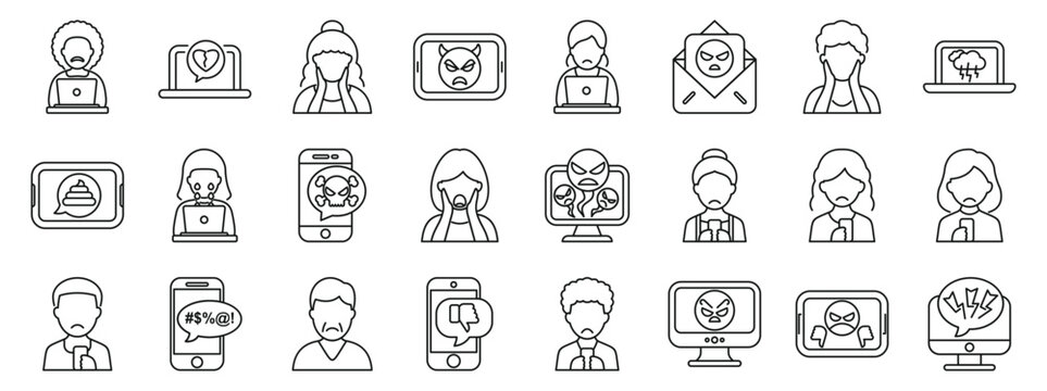 Cyberbullying Concept Illustration Showing Young Woman Facing Online Hate Speech, Insults and Harassment Through Social Media Messages, Digital Abuse and Negative Emojis