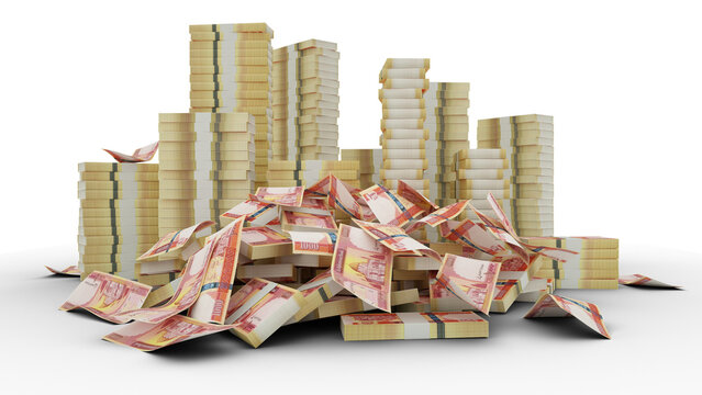 Big stacks of Afghan Afghani notes. A lot of money isolated on transparent background. 3d rendering of bundles of cash