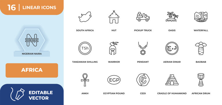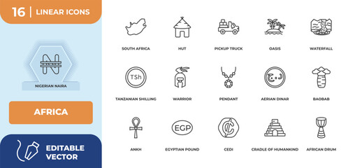 outline icons set - africa concept. nigerian naira, south africa and more.