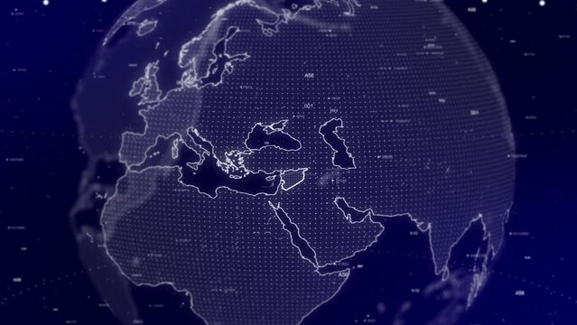 A cinematic video background showcases a digital globe rotating, zooming in on Syria country.Data analysis Technology Globe rotating on Syria Country data analysis technological background