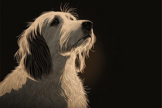 a dog is looking up at something in the distance with a black background and a brown border around it, with a black background and white border around the dog is a light brown border. Generative AI