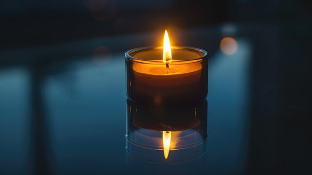Tea light candle aflame against dark backdrop reflecting in dark mirror detailed perspective