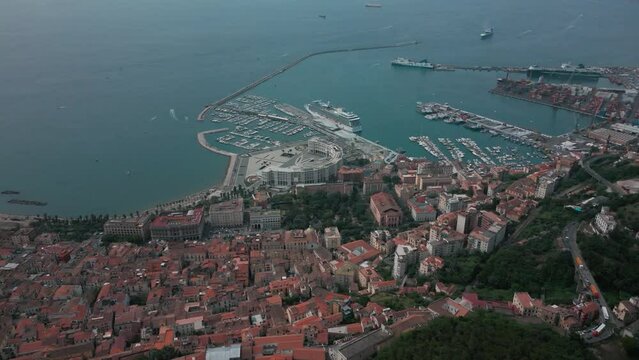 aerial view from the drone of the Gulf of Salerno with its commercial port, the crystal clear sea, the castle of Arechi, Piazza of Libertà