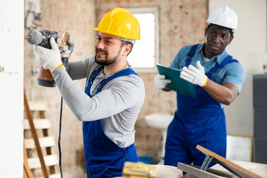 Head of construction checks how the builder works with a puncher