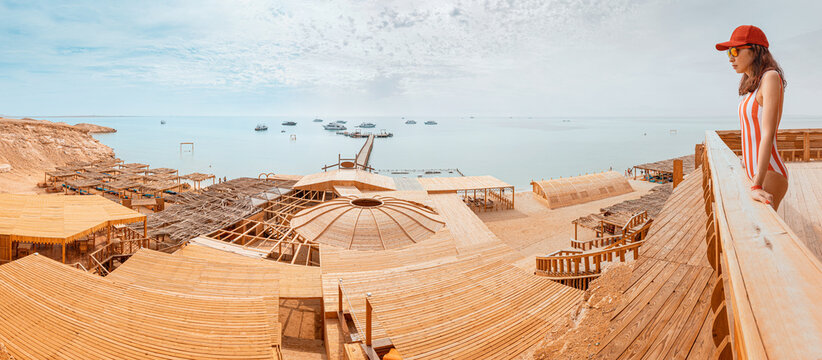 A girl in a fashionable swimsuit is sunbathing on the beach in Giftun island or Orange Bay in Egypt