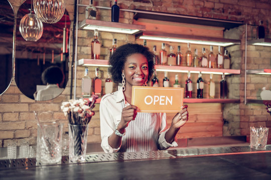 Bewitching beaming young-adult Afro-American bartender holding open sign in hands