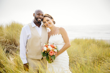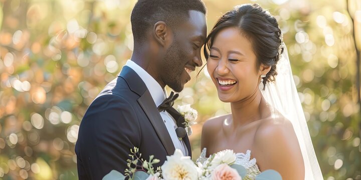 professional photo of happy asian bride and african american groom at wedding ceremony, playful, joyful, optimistic --ar 2:1 Job ID: 16d9132b-69c2-4fd1-a179-3fa4e684ed31
