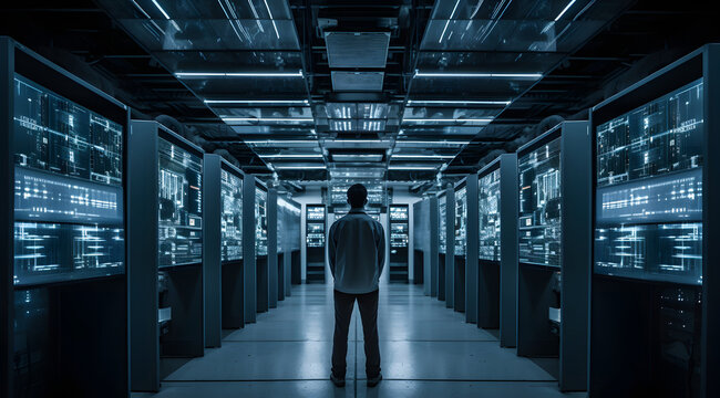 IT engineer in a large database server center office, surrounded by racks of hardware in a big cloud data center. Illustrating high-speed data transfer, server management, and advanced technology.