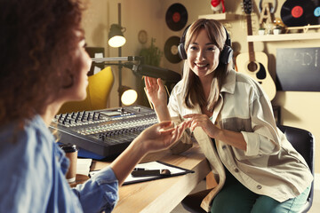 Beautiful multiethnic blogger couple hosting a podcast in a studio. Smiling woman and man wearing headphones sitting at a table with microphones and chatting cheerfully. Modern media technologies.