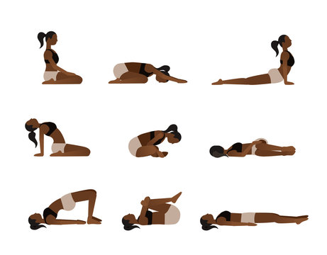 Yoga poses for better sleep. Vector illustrations with african american woman in sport bra and shorts doing asanas from insomnia and relaxing. Healthy poster in flat vector design.