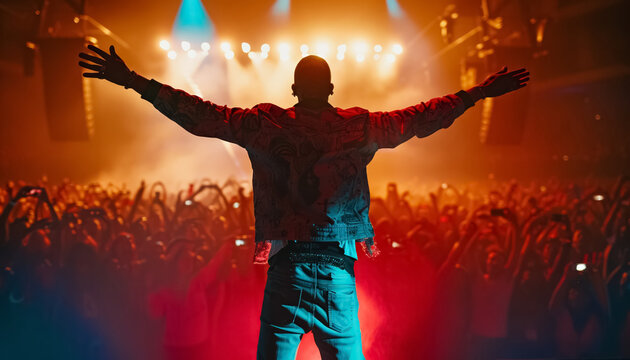 silhouette of black african american hip hop artist or rapper on illuminated scene with crowd of people, musical festival event with famous celebrity