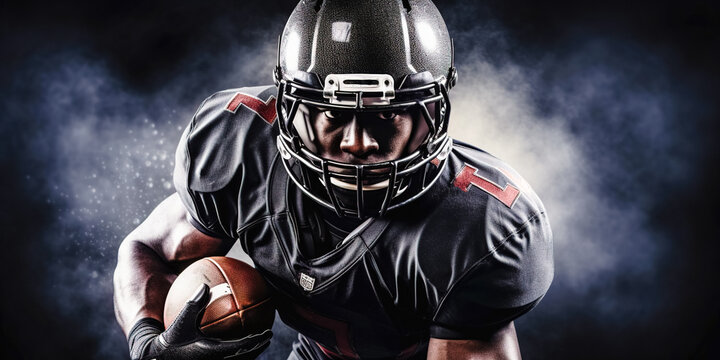 Portrait of American football player running with the ball. Muscular African American athlete in a black and white uniform with an ovoid ball in a dynamic pose. Isolated on black background.
