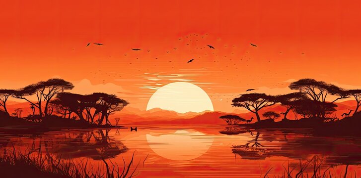african background with birds flying over calm water and orange sky, framed by tall trees