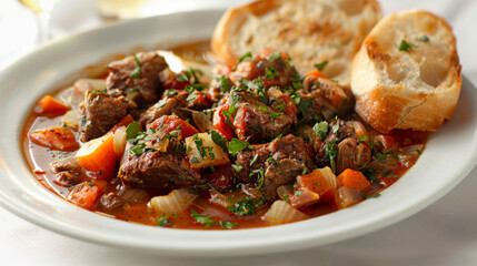 Authentic african beef stew with carrots, onions, and herbs, served with crusty bread on a white plate, perfect for a savory meal