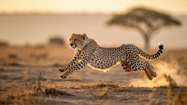 A cheetah sprints across the african savanna in a burst of speed, its sleek body a blur of motion against the golden backdrop of the setting sun