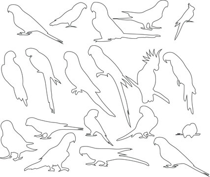Outline sitting parrot icon set with tropical style, flat vector on white background for creative wildlife designs.