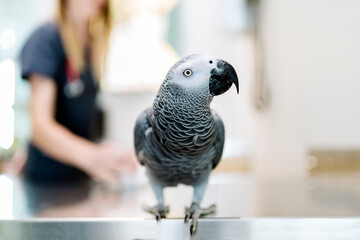 Congo African Grey red cake parrot. Timneh African Grey ruffles his neck feathers.