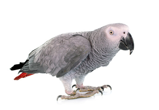 Unique African grey parrot with red tail feathers and a curious expression, perched on white.
