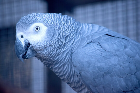 Head portrait of a grey parrot, close-up photography of the african bird of Congo. Psittacidae timneh.