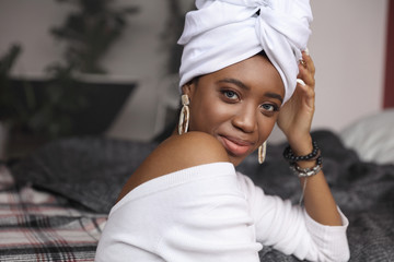 Art portrait african woman fashion model on black background gold luxury accessories bijouterie jewelry bracelet earrings Beautiful face sexy girl metallic golden professional makeup s : Generative AI