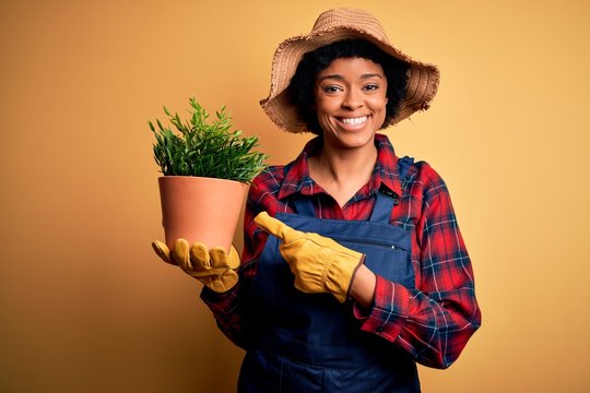 Young African American farmer woman with curly hair wearing apron holding pot with plants very happy pointing with hand and finger