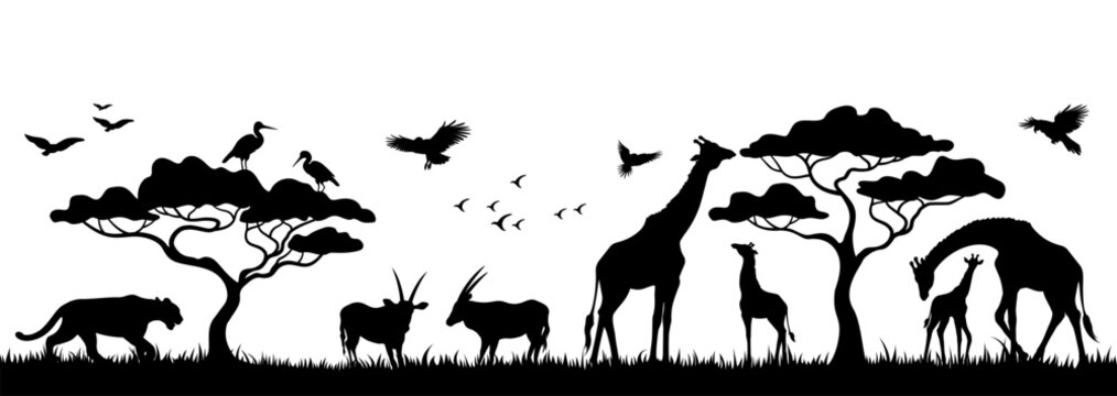 Silhouette of animals and birds in the savannah. African landscape scene. Vector horizontal seamless tropical background with lions, giraffes, antelopes and flying birds. Black isolated silhouette