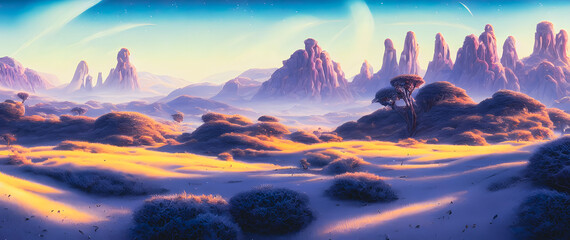Artistic concept of painting a beautiful landscape of savannah in Africa, with meadows in the background. Tender and dreamy design, background illustration