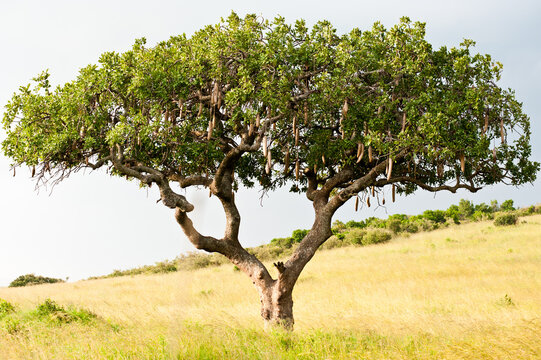 Kigelia africana Sausage tree flowers on the ground, night blooming tree, African honey plant.