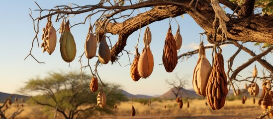 Focus on various seed pods of the Kigelia africana tree, also called the Sausage tree or Worsboom in Afrikaans.