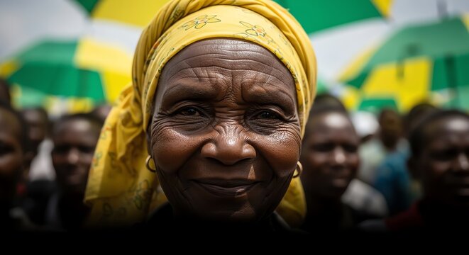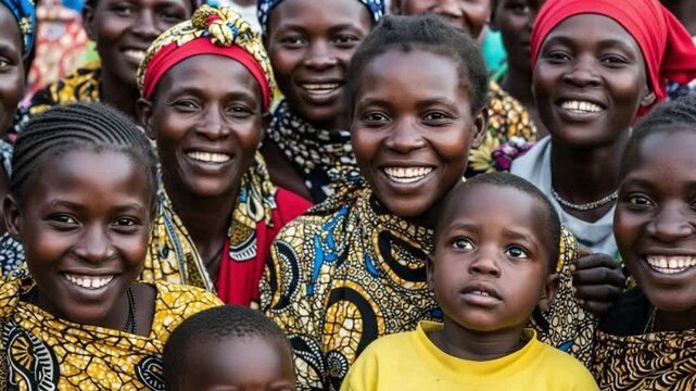 A group of smiling african women and children wearing colorful traditional clothing and head wraps standing together